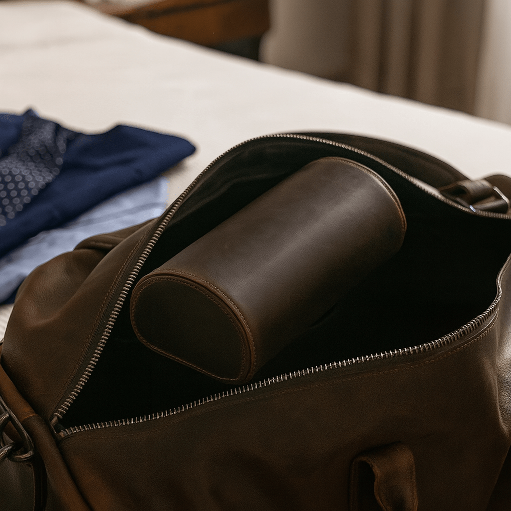 Designed for the discerning traveler, this 3-slot leather watch roll offers a refined and secure way to carry multiple timepieces. Lined with soft suede and fastened by snap buttons, it protects your watches from scratches and shocks while on the move. An elegant essential for collectors who value both style and practicality.