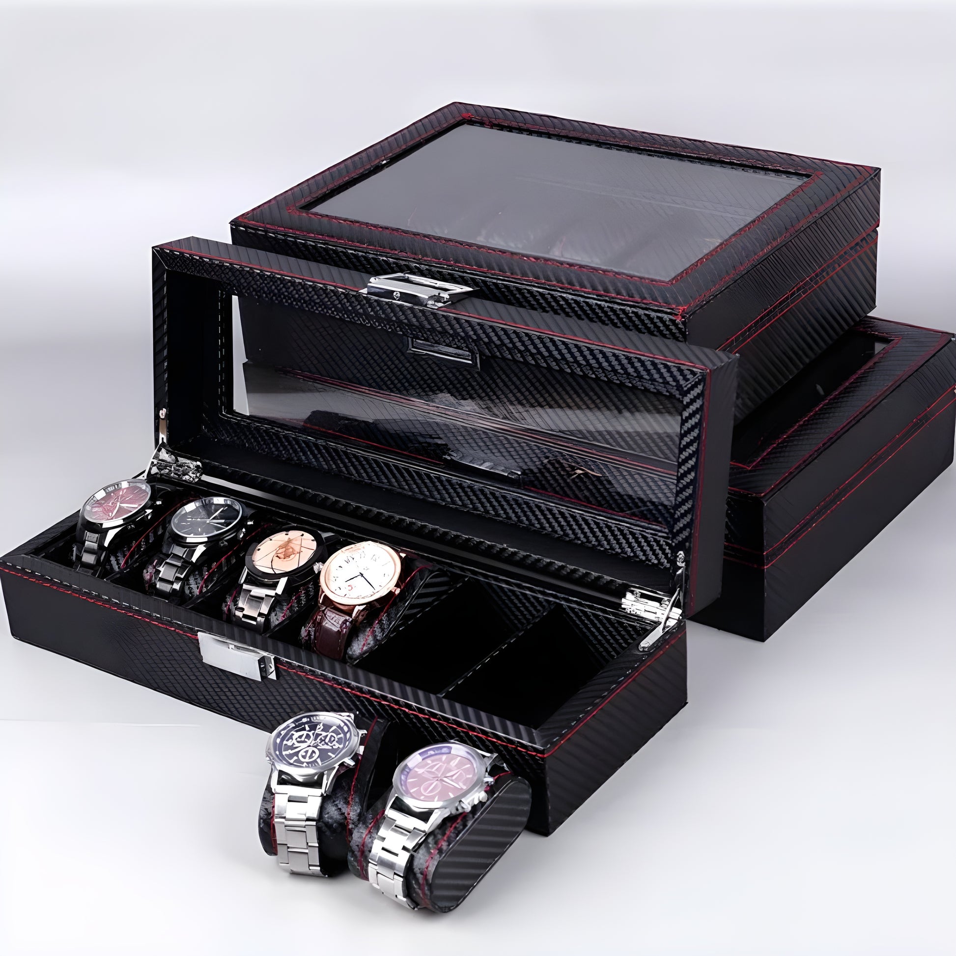 Watch box with carbon fiber-style finish, red contrast stitching and a transparent glass lid. Holds twelve watches in padded slots with a secure silver-tone clasp. Ideal for home display or storing your collection.
